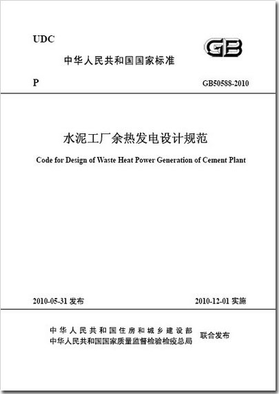 中華人民共和國住房和城鄉(xiāng)建設(shè)部發(fā)布第638號(hào)公告,由中國水泥協(xié)會(huì)、中材節(jié)能發(fā)展有限公司主編的國家標(biāo)準(zhǔn)《水泥工廠余熱發(fā)電設(shè)計(jì)規(guī)范》,自2010年12月1日起實(shí)施,標(biāo)準(zhǔn)編號(hào)GB50588-2010(http://www.csres.com/notice/38848.html)。