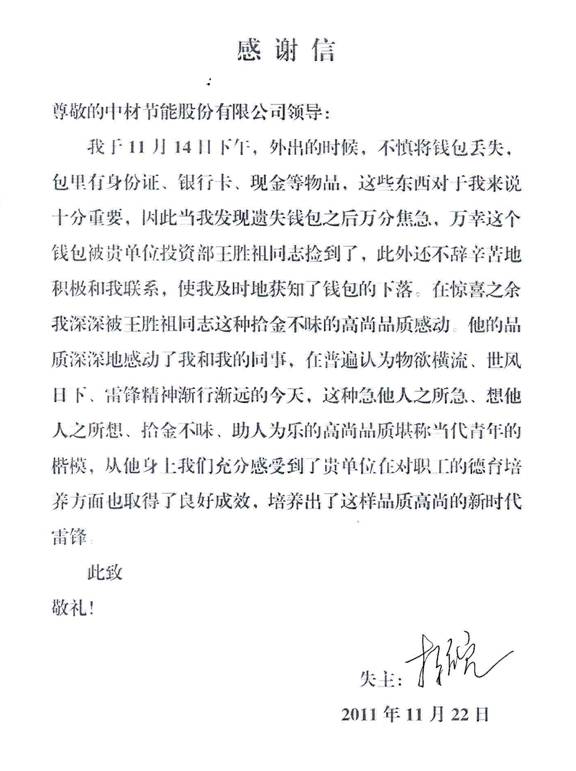 拾金不昧是中華民族的傳統(tǒng)美德,也是一個人所具備高尚品質(zhì)和崇高社會責(zé)任感的具體體現(xiàn)。2011年11月14日下午,我公司投資部的投資經(jīng)理王勝祖在天津出差時拾到一個錢包,內(nèi)有身份證、現(xiàn)金、銀行卡等重要物品。經(jīng)王勝祖多方查找,最終和失主李京皖先生取得聯(lián)系,并將錢包物歸原主。失主李先生看到自己的錢包失而復(fù)得時,當(dāng)即拿出200元表示感謝卻被王勝祖婉言拒絕。