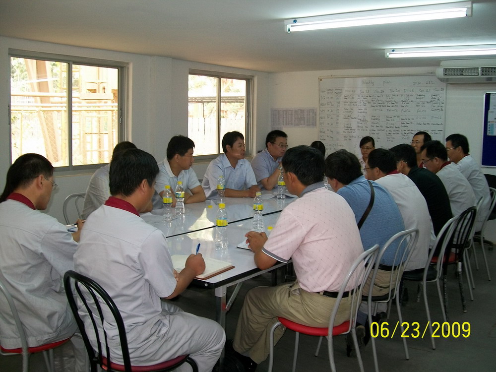 4月,泰國傳統的頌干節(相當于中國的春節)到來前期,張奇董事長率領市場部、技術部、采購部等部門負責人來到京都項目現場指導檢查工作。張董事長不顧旅途勞頓,清晨六點多即離開曼谷趕往項目現場所在地薩拉布里市郊的京都水泥廠。到達項目現場臨建辦公室后,隨即聽取了項目經理吳蘇軍代表現場項目部所作的工作匯報。根據匯報,結合項目當前總體執行情況,張董事長肯定了現場項目部的工作,并且指出,京都項目目前的總體執行情況符合公司制訂的計劃,要有信心依照總承包合同圓滿完成該項目。張董事長同時強調了京都項目的重要性,指示大家對后面的工作要盡早作出計劃,對各種可能出現的情況要做好充分準備,要適應業主的管理模式,在保證項目如期完成的同時,提高公司的項目管理水平,樹立中材節能更高的企業形象。王毅等三位部長也從各部門角度提出了具體的意見和建議。隨后,張董事長一行在項目部全體人員的陪同下查看了現場施工區域。